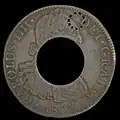 - 5 chelines de plata .903 de 1813 con agujero central, conocido como «dólar agujereado» (holly dollar en inglés, y sin denominación ni año estampado), en el anverso con contramarca circular con rayos de sol sobre un real de a ocho novohispano de la ceca de México con los años 1791 a 1808 y de un real de a ocho peruano de la ceca de Lima con los años 1808 a 1811.[3]