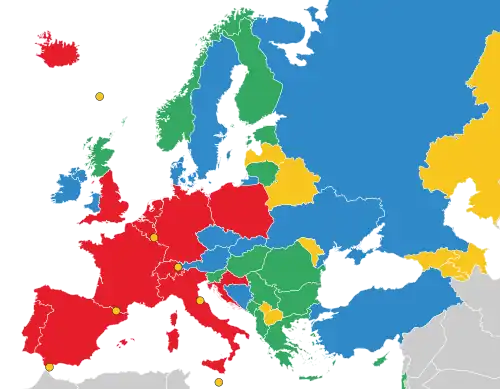 - ↑ La restricción se ha de aplicar a los siguientes emparejamientos: Armenia/Azerbaiyán, Gibraltar/España, Kosovo/Bosnia y Herzegovina, Kosovo/Rusia, Kosovo/Serbia, Rusia/Ucrania.