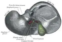 Cara inferior del hígado en la que puede verse el ligamento redondo (round ligament), | ||