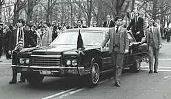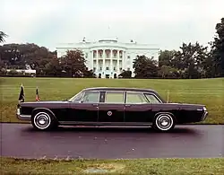 El presidente Johnson prefería los descapotables blancos, pero "las preocupaciones por el protocolo y la seguridad" hicieron que recibiera un Lincoln Continental negro de 1967 como su coche estatal. El techo rígido le costó a la Ford Motor Company unos 500.000 dólares (equivalentes a unos 4.570.000 dólares en 2023). Lo alquilaron al gobierno federal por un coste anual de 1 dólar (equivalente a 9,14 dólares en 2023). Con 4.000 libras (1.800 kg) de blindaje, "una capota de burbuja más gruesa que la cabina protectora de un caza F-16" y un motor V8 de 340 caballos de fuerza (250 kW) , el coche de 11.000 libras (5.000 kg) aún podía alcanzar velocidades de 100 millas por hora (160 km/h) - o 50 millas por hora (80 km/h) con cuatro neumáticos pinchados. [11]Según portavoces de la Casa Blanca, el coche del presidente Johnson no estaba equipado con televisión, aunque varios de los miembros de su gabinete sí lo estaban. Este coche también sirvió a los presidentes Nixon, Ford y Carter, y viajó a 32 naciones antes de ser retirado a mediados y fines de la década de 1970. En 1996, la Ford Motor Company restauró el coche a su estado original y lo donó a la Biblioteca y Museo Presidencial Richard Nixon; el fabricante eligió la biblioteca de Nixon porque llevó el coche en varios de sus viajes presidenciales más importantes.[11]