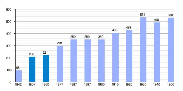 | Gráfica de evolución demográfica de Linares del Arroyo[11] entre 1842 y 1950 |
