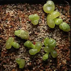 Forman grupos de dos hojas acopladas, divididas por una fisura por donde aparecen las flores. Cada par de hojas forman el cuerpo de la planta que tiene forma cilíndrica o cónica con una superficie plana. De la fisura entre las hojas brotan, en periodo vegetativo, las nuevas hojas y en cuanto se abren, las antiguas se agostan. Las hojas son de color gris y arcilla, la lámina de la hoja superior es esférica, con una ventana transparente grande, las flores son de color blanco con tonos rosados.