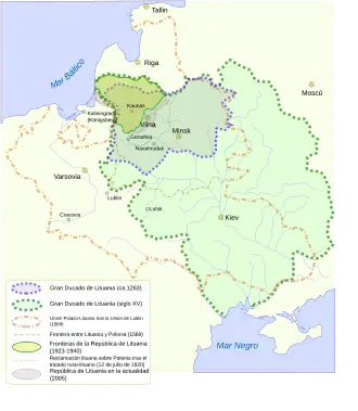 Después fue de nuevo anexionada a Polonia formando la República de las Dos Naciones o Mancomunidad de Polonia-Lituania en virtud de la unión dinástica de los dos estados en 1569, convirtiéndose así en el país más grande de Europa. Según el sistema de unión de los dos países, Lituania pudo conservar un autogobierno. Posteriormente fue incorporada a Rusia en 1795 bajo el reinado de Catalina II de Rusia, tras un proceso de desintegración que duró todo el siglo XVIII (particiones de Polonia).