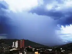 - Tormenta eléctrica. Es lluvia acompañada por actividad eléctrica y, habitualmente, por viento moderado o fuerte, e, incluso, con granizo. Las tormentas pueden tener intensidades desde muy débiles hasta torrenciales, e, incluso, a veces son prácticamente secas. La combinación de tormentas secas y chubascos puede presentarse en cualquier caso. Es decir, un chubasco fuerte con tormenta tiene un área pluvial reducida, la cual puede estar rodeada por una especie de círculo de mayor tamaño donde se dejan sentir los truenos y relámpagos pero no llueve.