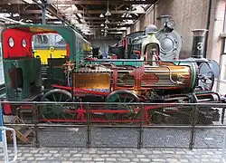Dos locomotoras de vapor. Pintada en verde, la máquina número 3 seccionada por el otro lado.Corte de locomotora Beyer Peacock de 1873.