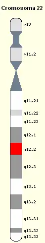 | 11.2 | Los números tras las letras representan la posición sobre el brazo: región 1, banda 1, y, tras el punto, subbanda 2. Las bandas son visibles bajo el microscopio cuando el cromosoma está adecuadamente teñido. Cada región se numera empezando por 1 la más cercana al centrómero. Bandas y subbandas son visibles a altas resoluciones. La correcta forma de leer estos números es "uno uno punto dos" (no "once punto dos"). |