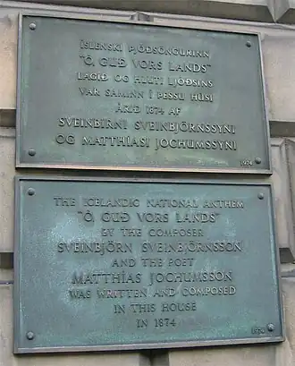 ![]() Placa conmemorativa en la casa de Edimburgo en la que fue compuesto el Lofsöngur. | ||