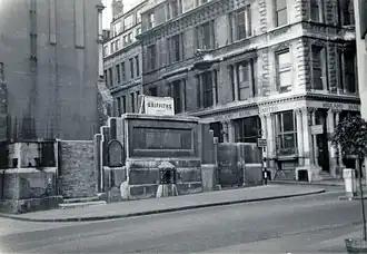 In 1940 St Swithin's church was burnt out by bombing in the Blitz. However, the outer walls remained standing for many years, with London Stone still in its place in the south wall. In 1962 the remains of the church were demolished, and replaced by the present building, 111 Cannon Street, which originally housed the Bank of China; London Stone was placed without ceremony in the specially constructed grilled and glazed alcove in the new building that houses it today.[20]