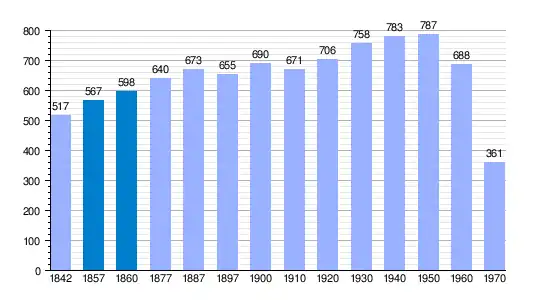 | Gráfica de evolución demográfica de Loranca del Campo[3] entre 1842 y 1970 |