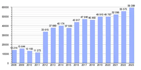 | Gráfica de evolución demográfica de Los Palacios y Villafranca[7] entre 1842 y 2021 |