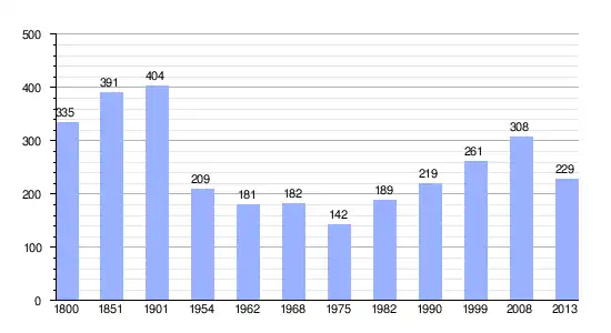 Los datos demográficos contemplados en este gráfico de la comuna de Loudenvielle[3] se han cogido de 1800 a 1999 de la página francesa EHESS/Cassini, y los demás datos de la página del INSEE.[4]