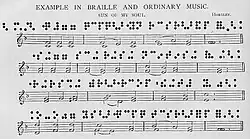La música tuvo un especial lugar en la vida de Louis Braille. Durante toda su vida se dedicó a dar clases de música y también fue un instrumentista notable. Asimismo, ideó un sistema de notación musical en braille (Signografía Musical Braille, actualmente conocido como musicografía) para personas con discapacidad visual y estudió también las posibles formas de comunicación entre la escritura musical en tinta y en relieve con la intención de que pudieran ser empleados e intercambiados de forma recíproca entre personas videntes y discapacitadas. Debemos tener presente que durante la década del siglo XVIII e incluso a principios del XIX era habitual identificar la ceguera con la mendicidad, cosa que provocó que durante muchos años se eliminara la enseñanza musical de los programas escolares para evitar su parentesco.[22][23]
