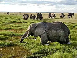 El elefante africano de sabana (Loxodonta africana) es un mamífero proboscideo de la familia de los elefántidos.[2]​ Es el mayor mamífero terrestre que existe en la actualidad. Se trata de una de las tres últimas especies de proboscídeos que sobreviven hoy en día, siendo las otras el elefante africano de bosque (Loxodonta cyclotis, previamente considerado una subespecie de L. africana) y el elefante asiático (Elephas maximus). Desde 2021 el elefante africano ha sido catalogado como en peligro de extinción en la Lista Roja de la UICN debido a que se descubrió que la población mundial ha disminuido en más del 50 % durante tres generaciones.[3]​ Aproximadamente el 70 % de su área de distribución se encuentra fuera de las áreas protegidas.