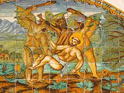 Este tipo de loza polícroma se dio también en azulejería, con dibujos de tipo religioso o popular; entre estos últimos destacaban las fiestas, los paisajes, las corridas de toros y las batallas navales.[2] Una variante muy popular fueron los azulejos de oficios, decorados con figuras de artesanos de los diversos oficios de la época, de moda entre los siglos xvii y xix.[8] Estas representaciones derivaban de las auques (aleluyas) típicas catalanas, con un trasfondo netamente popular. Los más conocidos son los de oficios, pero también había otro tipo de representaciones, como los bestiarios, que presentaban animales fantásticos y mitológicos, la mayoría tomados de las procesiones del Corpus. Luis María Llubiá los clasificó según el tema floral que servía de marco a las escenas principales, con nombres como «margarita», «hoja de lirio», «palma», «hoja de pita», etc.[9]