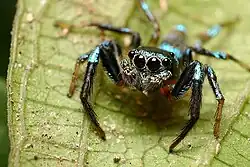 - ↑ Li, D., Yik, S.H. & Seah, W.K. (2002). «Rivet-like nest-building and agonistic behaviour of Thiania bhamoensis, an iridescent jumping spider (Araneae: Salticidae) from Singapore». The Raffles Bulletin of Zoology. Archivado desde el original el 11 de agosto de 2007. Consultado el 22 de agosto de 2007.