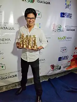![]() Luis Avilés con 4 premios de la Iguana Dorada en el Festival Internacional de Cine de Guayaquil, en 2018. | ||