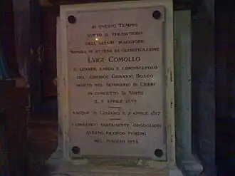 Luis Comollo era un estudiante del Seminario Diocesano de Chieri, en la Arquidiócesis de Turín que es célebre por haber sido el mejor amigo de Don Bosco, el cual escribió su vida y fue uno de los primeros libros del santo de Turín. Una lápida en Cinzano fue puesta en honor de Comollo y sus restos descansan bajo el Altar de la Iglesia del Seminario de Chieri. Su vida ejemplar como estudiante y como cristiano le valieron que después de su muerte su tumba fuera profanada por varios de sus compañeros que cortaron algunos dedos de su mano como reliquias. Este hecho ha obstaculizado cualquier intención de sentar una causa de canonización por parte de la Iglesia católica. Por otro lado, su gran devoción estuvo influenciada por el rigorismo moral de la época y en general es objeto de interés para contrastar su vida con la del padre del sistema preventivo.