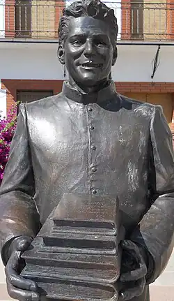 ![]() Estatua del Padre Luis, erigida en su pueblo natal, frente a una de las puertas del primer convento de la orden fundada por él mismo. | ||