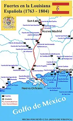 Bernardo de Gálvez tomó posesión de los cargos de alcalde de Nueva Orleans y gobernador interino de la Luisiana Española,[12] que Francia había cedido a España en 1763 en compensación por la entrega de La Florida a Inglaterra tras la guerra de los Siete Años,[13] el 1 de enero de 1777.[14][15] Su principal misión era estar al tanto de los acontecimientos en las colonias británicas en Norteamérica, inmersas en la guerra, y preparar el territorio para un posible conflicto con el Reino Unido.[16][15] La región estaba poco poblada, tanto de habitantes de la colonia —libres y esclavos— como de indios.[17] Durante las primeras décadas de la dominación española, sin embargo, creció rápidamente: según el censo de tiempos del gobierno de O'Reilly (1769), había 13 513 habitantes —excluidos los indios— y veinte años después, la población había crecido hasta los 31 433.[18] A finales de siglo, empero, la población se estancó.[11] El porcentaje de población española era, además, muy bajo: al final del periodo español apenas alcanzaba el 15 %.[19]