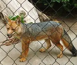Esta subespecie tiene el aspecto de un zorro robusto, de cabeza y patas rojizas, vientre, cuello y boca blancos y lomo gris rayado de negro. La cola está muy poblada de pelos grises que se vuelven negros en su punta.