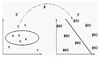 Debido a las limitaciones computacionales de las máquinas de aprendizaje lineal, éstas no pueden ser utilizadas en la mayoría de las aplicaciones del mundo real. La representación por medio de funciones Kernel ofrece una solución a este problema, proyectando la información a un espacio de características de mayor dimensión el cual aumenta la capacidad computacional de la máquinas de aprendizaje lineal. Es decir, mapearemos el espacio de entradas X a un nuevo espacio de características de mayor dimensionalidad (Hilbert):
