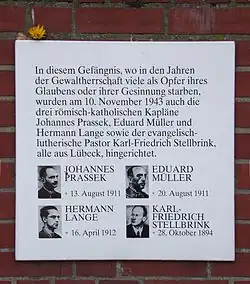 - ↑ Untersuchungshaftanstalt Hamburg-Stadt sitio web, en idioma alemán. Entre 1938 y el final de la guerra, en 1945, se llevaron a cabo 500 ejecuciones en este sitio. Una placa en el muro de la prisión honra ahora a los cuatro mártires de Lübeck.