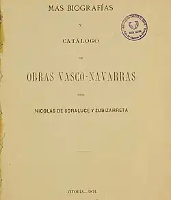 - Soraluce y Zubizarreta, Nicolás de (1871). Más biografías y catálogo de obras vasco-navarras. Vitoria. Wikidata Q114072775.