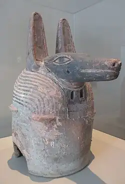 El dios Anubis, en egipcio Inpu, estaba al lado del dios Osiris como un importante dios funerario en el antiguo Egipto. Durante el ritual de embalsamamiento y el funeral, un sacerdote interpretaba el papel de Anubis. Podía transformarse en el dios usando una máscara. Para Anubis, este fenómeno aparece por primera vez constatado durante el reinado de Tutmosis III - Amenofis II, es decir, en el siglo XV a. C. La máscara muestra la cabeza del dios de la momificación y la muerte Anubis en una forma estilizada, generalmente se le representa en una forma mixta de cuerpo humano y cabeza de chacal. El negro del pelaje del animal aún es claramente reconocible, lo que no corresponde a la coloración natural marrón del animal, sino que este color en el arte egipcio se refiere simbólicamente al área de la muerte, por un lado, y por el otro, indica la existencia en la eternidad. La máscara consta de dos partes. El área del hocico está conformada por sí misma y provista de un pin perforado. Este se inserta a través de un orificio en la máscara y se puede mantener en su lugar mediante un pedazo de madera que se empuja a través del orificio en el pasador. Las dos rendijas de los ojos, que hacían posible que el sacerdote pudiera ver, se pueden apreciar claramente bajo el hocico cánido. Hay recortes para encajar los hombros en ambos lados, de modo que la máscara quede unida de manera razonable al torso. Las líneas pintadas que corren alrededor de la cabeza indican una peluca ritual. Une animal y humano de una manera estéticamente aceptable.
