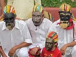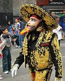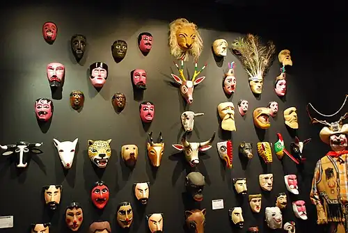 Las máscaras en México son utilizadas para una gran variedad de bailes, ceremonias, festivales y obras de teatro, estas van acompañadas de vestuarios o disfraces.[24][25] El uso más común de las máscaras es en los bailes tradicionales, los cuales son como obras de teatro, con una historia, personajes, música; la única diferencia es que los músicos no son profesionales.[19][26] El propósito de las máscaras es convertir a los actores en otros personajes.[27] Las máscaras son un elemento muy importante, incluso si el actor o bailarín no utiliza una máscara, debe de usar lentes oscuros para indicar que no es el mismo, también existe el doble "enmascaramiento" que consiste en usar lentes oscuros sobre la máscara.[28] En algunas ocasiones, los actores hombres representan papeles de mujeres utilizando las máscaras. La razón de esto es que en Europa se prohibía que las mujeres actuaran o bailaran, esa misma prohibición llegó a México con la conquista de los españoles. Un ejemplo de un personaje que es representado por hombres es la Malinche, que es un personaje de la danza sobre la conquista.[29]
