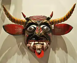 Sin embargo, las máscaras fantásticas más comunes son las del diablo, los demonios y el mismo Satanás.[45] El diseño de estos personajes varía, algunos tienen cara de seres humanos normales, otras tienen características más salvajes y/o grotescas y pueden llevar detalles de ser humano, de animal o de ambos.[31][62] Las descripciones de los dioses prehispánicos se plasmaron en máscaras, Tlaloc es representado generalmente con serpientes alrededor de sus ojos y con los colmillos de una víbora, estos elementos se encuentran actualmente en la máscara de diablo. Tezcatlipoca era un dios de la noche, sus colores eran rojo y negro, estos colores también se aplican en la máscara del diablo.[62]