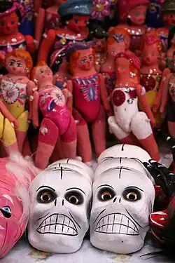 Además de las más5, p.8-9</ref> Las máscaras con forma de cráneo tienen su origen en la época prehispánica, la representación de la muerte en esos tiempos no era algo que les provocara miedo, al contrario ellos lo veían como parte de la vida. Actualmente los cráneos siguen representado a la muerte y puede ser blancos o con algunas decoraciones extravagantes, algunos cráneos tienen la expresión seria y otros sonrientes.[61] Algunos personajes enmascarados representan conceptos abstractos como el tiempo y los siete pecados capitales.[62]