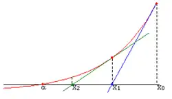En la ilustración adjunta del método de Newton se puede ver que es una mejor aproximación que para el cero (x) de la función .