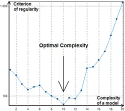 En contraste a las redes neuronales tipo-GMDH, el algoritmo Combinatorio no puede pararse en un nivel de complejidad seguro ya que in punto de incremento del valor del criterio puede ser simplemente un mínimo local, ver Fig.1.