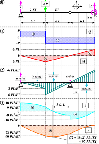 Aquí el cortante V se compara con la pendiente θ, el momento M se compara con la deflexión v, y la carga externa w compara con el diagrama M/EI. En la figura se muestra un diagrama de cortante, momento y otro diagrama de deflexión. El diagrama M/EI es un diagrama de momento dividido por el producto del módulo de Young de la viga y su momento de inercia.