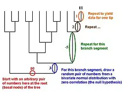 Martins y Garland[9] propusieron en 1991 que una forma de explicar las relaciones filogenéticas al realizar análisis estadísticos era usar simulaciones por computadora para crear muchos conjuntos de datos que fueran consistentes con la hipótesis nula bajo prueba (por ejemplo, no hay correlación entre dos rasgos, no diferencia entre dos grupos de especies definidas ecológicamente) pero que imitan la evolución a lo largo del árbol filogenético relevante. Si dichos conjuntos de datos (típicamente 1,000 o más) se analizan con el mismo procedimiento estadístico que se usa para analizar un conjunto de datos real, entonces los resultados de los conjuntos de datos simulados se pueden usar para crear la filogenética correcta (o "PC"[7] ) distribuciones nulas del estadístico de prueba (por ejemplo, un coeficiente de correlación, t, F). Tales enfoques de simulación también se pueden combinar con métodos como los contrastes filogenéticamente independientes o PGLS.