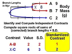 El algoritmo implica calcular valores en nodos internos como un paso intermedio, pero generalmente no se usan para inferencias por sí mismos. Se produce una excepción para el nodo basal (raíz), que se puede interpretar como una estimación del valor ancestral para todo el árbol (suponiendo que no se hayan producido tendencias evolutivas direccionales [p. ej., La regla de Cope ]) o como una estimación ponderada filogenéticamente de media para todo el conjunto de especies de puntas (taxones terminales). El valor en la raíz es equivalente al obtenido del algoritmo de "parsimonia de cambio cuadrado" y también es la estimación de máxima verosimilitud bajo el movimiento browniano. El álgebra de contrastes independiente también se puede usar para calcular un error estándar o un intervalo de confianza .