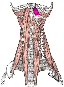 Este tiene como función flexionar la cabeza y el cuello sobre el atlas. Es inervado por el C1 y C2.[1]