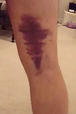 Moretón debido a una distensión (desgarro) isquiotibial. Las líneas horizontales son huellas dejadas por el vendaje.