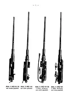 Fueron construidas dos versiones del MG 151/20. Los primeros cañones tenían un sistema de percusión mecánico, mientras que los posteriores modelos "E" tenían percusión eléctrica. Algunos proyectiles tenían un mecanismo de autodestrucción y/o mezcla trazadora. Las cargas explosivas también eran diversas, ya sea el PETN estándar, una mezcla llamada HA 41 (hexógeno y aluminio, con el segundo incrementando la capacidad explosiva e incendiaria en un 40 %),[14]​ y una versión comprimida donde más explosivos (HA 41) eran comprimidos en el mismo lugar bajo grandes presiones (MX).[15]