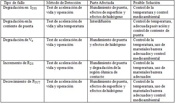 - Efectos del hidrógeno: Produce degradaciones de IDDS, VP, gm y POUT. Se da en recipientes encapsulados herméticamente en condiciones de hidrógeno. Se cree que el hidrógeno atómico se difunde en los canales de GaAs y formas Si-H, neutralizando los donantes, lo que puede reducir la concentración de portadores en el canal, que, a su vez, puede disminuir la fuga de corriente, transconductancia y la ganancia del dispositivo. Algunas de las posibles soluciones incluyen tratamiento térmico de los materiales de empaquetado para reducir la cantidad de hidrógeno a partir del empaquetado hermético, y el uso de barreras materiales que no contengan las estructuras Pt / Ti o Pd / Ti. Estas soluciones tienen limitaciones y los posibles problemas de inestabilidad que deben ser plenamente corregidos antes de su aplicación en entornos de alta fiabilidad.