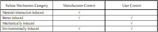 - Contaminación iónica: Puede producir cambios en la concentración umbral y esto en cambios de voltaje. La contaminación iónica puede ocurrir durante el proceso, el empaquetamiento, la interconexión y el funcionamiento en un lugar desprotegido. La preparación de la superficie y la limpieza, la caracterización y control de materiales y entornos, y la protección (pasivación) de la zona activa de los dispositivos puede reducir o eliminar algunos fallos relacionados de la contaminación iónica. El horneado y la exposición a altas temperaturas durante la combustión en dichas medidas han resultado ser eficaces como métodos de detección de problemas de contaminación iónica.