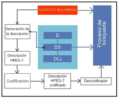 - Esquemas de descripción (Multimedia Description Schemes) (DS): especifica la estructura y semántica de las relaciones entre sus componentes, que pueden ser descriptores (D) o esquemas de descripción (DS).