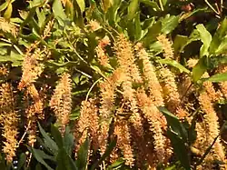 Esta especie tiene un follaje denso y crece hasta 18 metros de altura. Las hojas, las cuales tienen los márgenes dentados y miden de 7 a 25 cm de largo. Tiene flores largas pendientes rosas cremosas a púrpura, a las cuales le siguen frutos leñosos y redondeados, los cuales miden de 2 a 3 cm de diámetro y contienen semillas (Frutos secos) comestibles.[1]