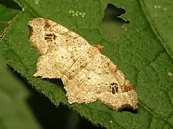 Las alas anteriores cuentan con tres líneas ocres, de ancho variable, usualmente estrechas. La marca distintiva de la especie es la gran mancha marrón redondeada, dividida en cinco o seis porciones por las vénulas medianas, de las cuales las dos o tres internas se sitúan en la tercera línea externa. La depresión subapical del ala es profunda.[6]