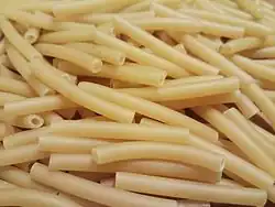 El macarrón (en italiano maccheroni) es un tipo de pasta italiana elaborado con agua, harina de trigo y, a veces, huevo, que suele tener forma de canuto alargado,[1] conocidos como plumas.
