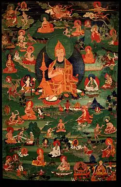 Pintura tibetana con Nāgārjuna (derecha) y Āryadeva (centro).