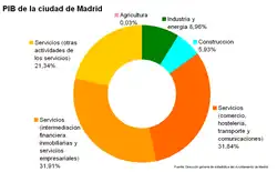 En el plano económico, según el informe realizado por PwC sobre la evolución de la población y la economía de las principales capitales mundiales en 2009, es la cuarta ciudad más rica de Europa en PIB per cápita medido en términos de paridad de poder de compra, tras Londres, París y Moscú.[17] En 2009, el 50,1 % de los ingresos de las 5000 principales empresas españolas son generados por sociedades con sede social en Madrid, que suponen el 31,8 % de ellas.[18] Es sede del 4.º mayor mercado de valores de Europa,[19] 2.º en el ámbito iberoamericano (Latibex), y de varias grandes corporaciones.[20][21] Es la 8.ª ciudad del mundo con mayor presencia de multinacionales.[22][23] Cuenta con un PIB nominal de 181 280 millones de euros (2023) —el 12,4 % del PIB nacional— y un PIB per cápita nominal de 50 216 € (2022), siendo la 1.ª área metropolitana española en actividad económica −19 % del PIB.[24]
