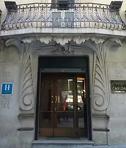 1902-1904 | Ubicado en la calle del Maestro Victoria, este antiguo edificio de viviendas, promovido por la marquesa de Villamejor, casi no posee rasgos modernistas, debido a las radicales reformas llevadas a cabo para su conversión en hotel, que han supuesto la práctica desaparición de una de las obras clave del primer modernismo madrileño.[15] En los planos originales se observa una composición simétrica, con un eje axial que articula todo el conjunto y del que arrancan distintos elementos vinculantes que envuelven la fachada.[19] Del proyecto primitivo solo se conservan algunas rejas y la portada principal, labrada con formas vegetales. | ![]() |