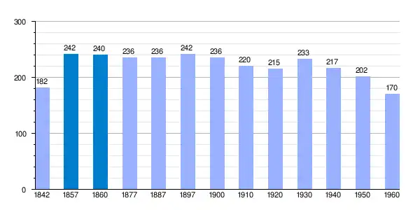 | Gráfica de evolución demográfica de Madruedano[5] entre 1842 y 1960 |