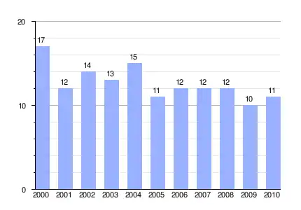 | Gráfica de evolución demográfica de Madruédano entre 2000 y 2010 |
